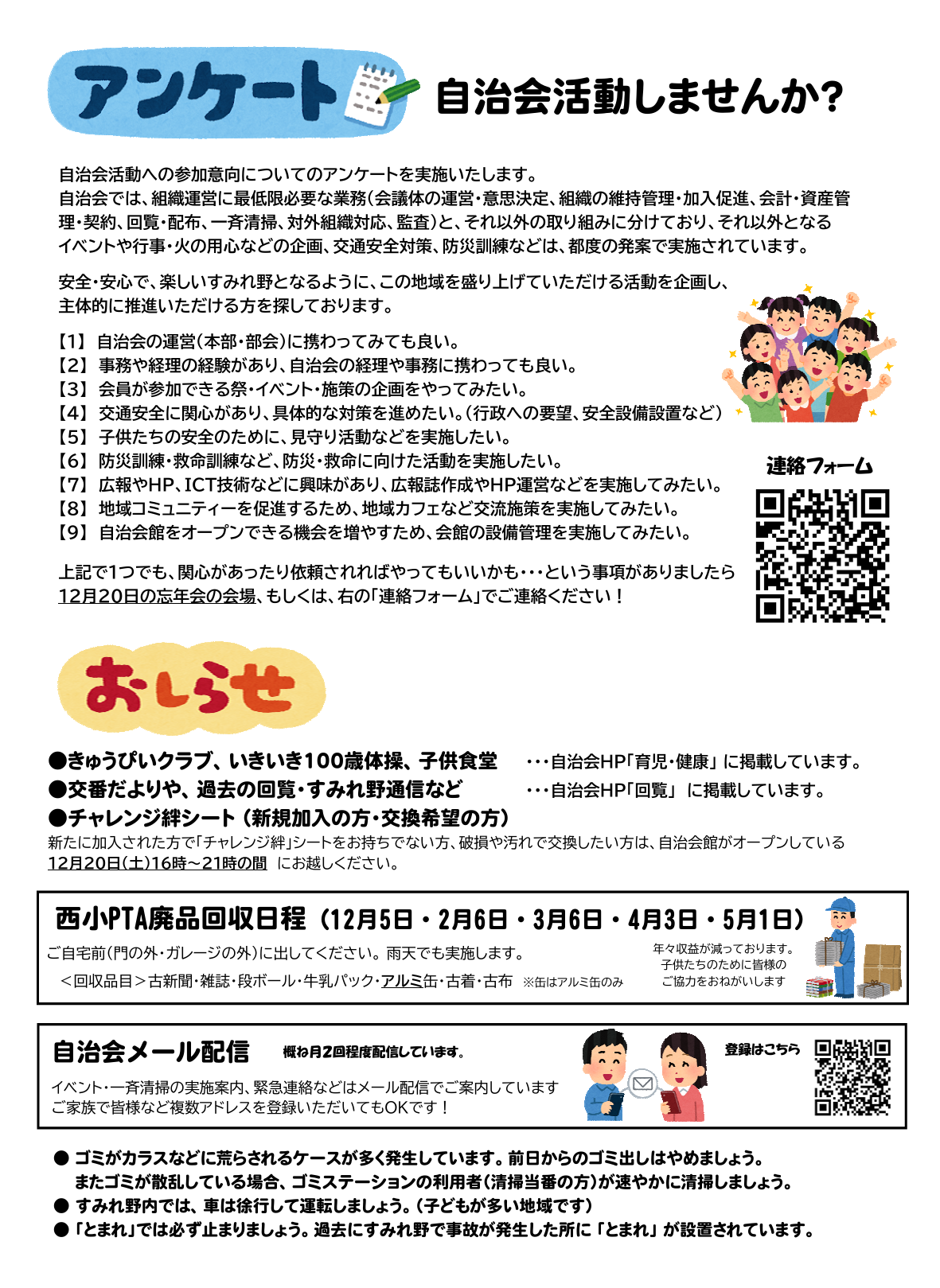 【回覧】自治会館オープニングイベント結果、訪問勧誘お断りステッカー・不審者情報・総会結果・清掃日程・西小PTA廃品回収